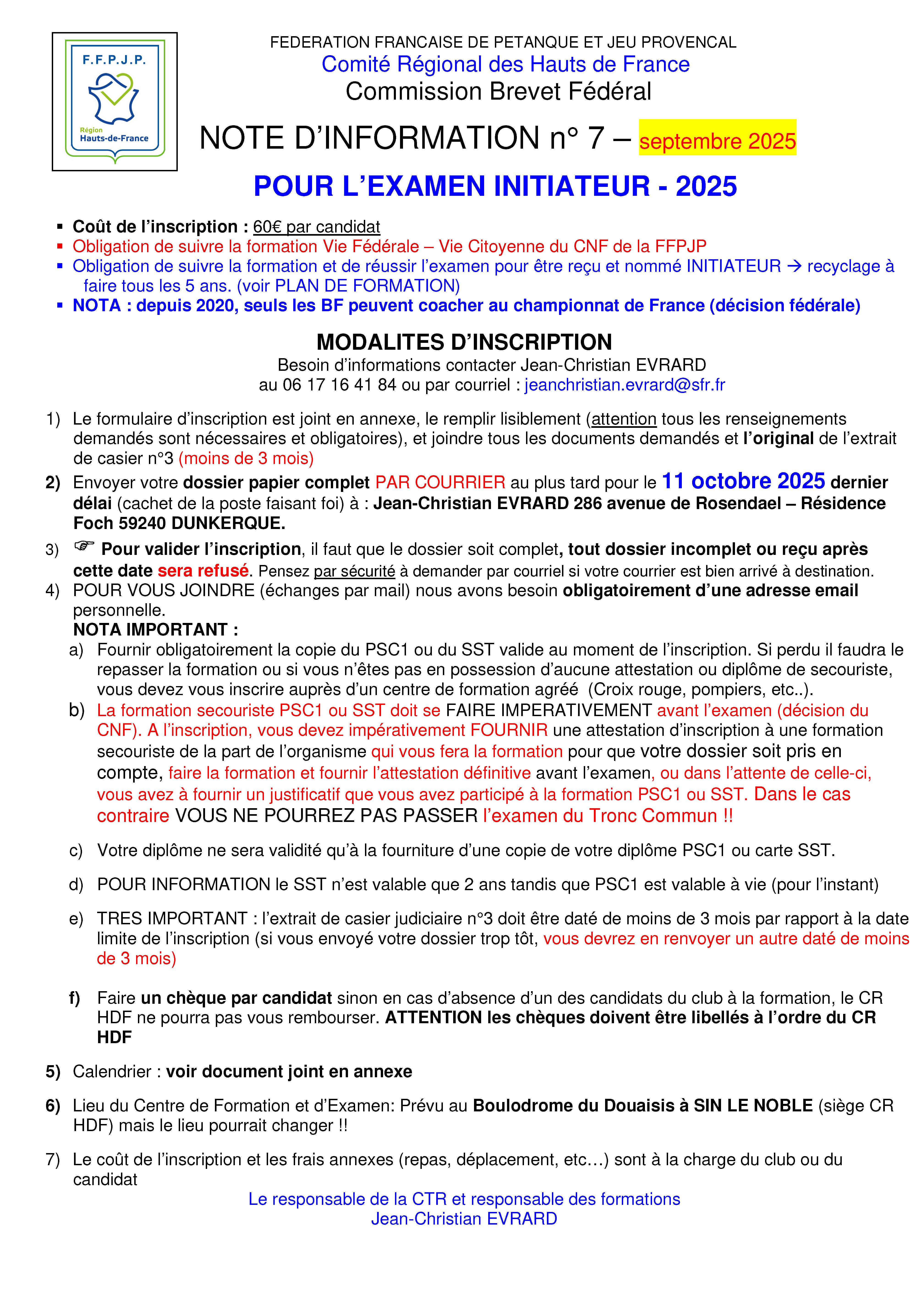 Les inscriptions pour cette dernière, se feront sur le site Fédéral (le formulaire d’inscriptions devrait mis en ligne début octobre 2025)