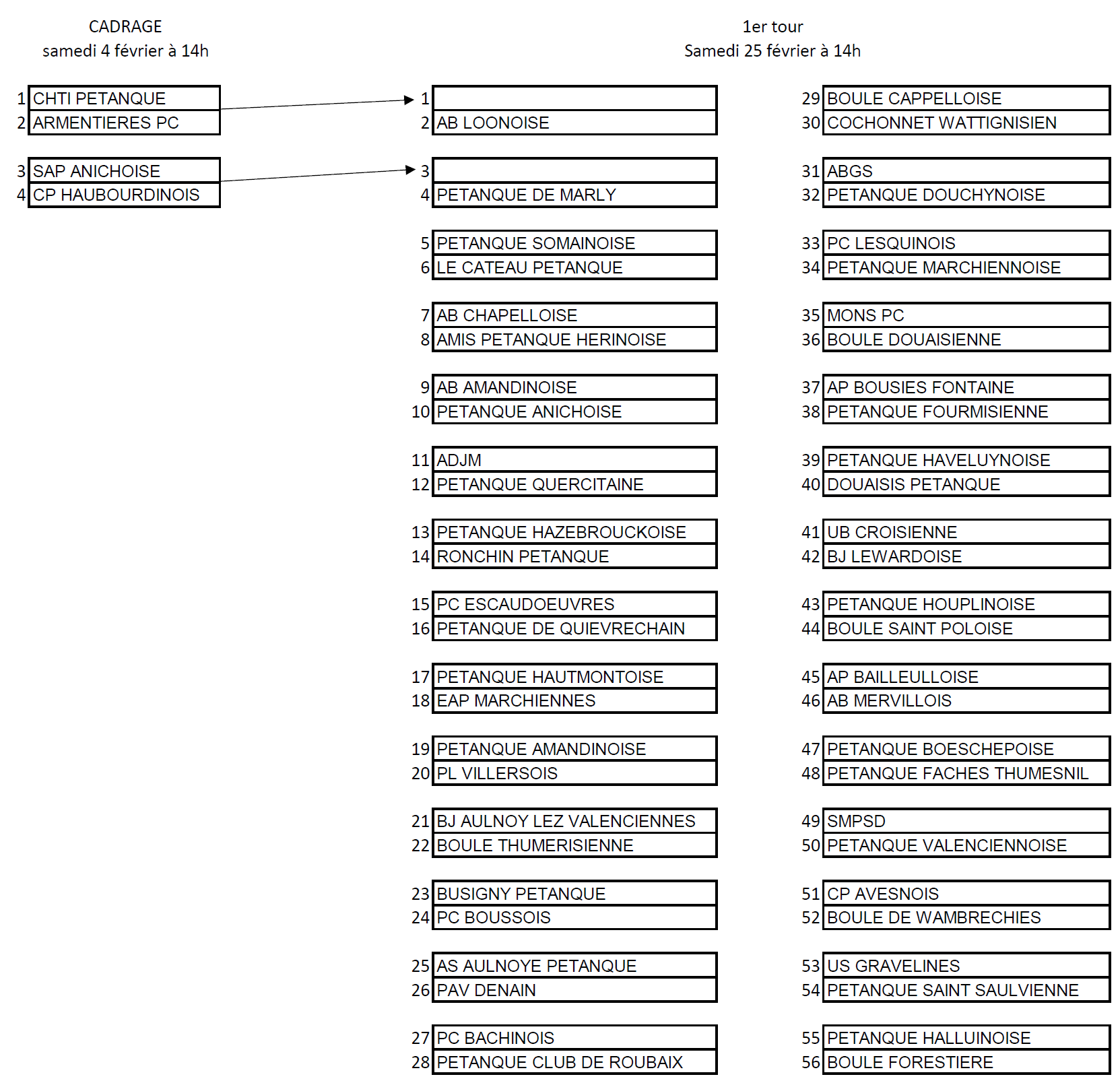 - Les 28 équipes éliminées et les 2 perdants des cadrages intègrent la coupe du Nord (sauf si non engagement du club pour cette compétition) (date butoir dimanche 19 mars à 14h)