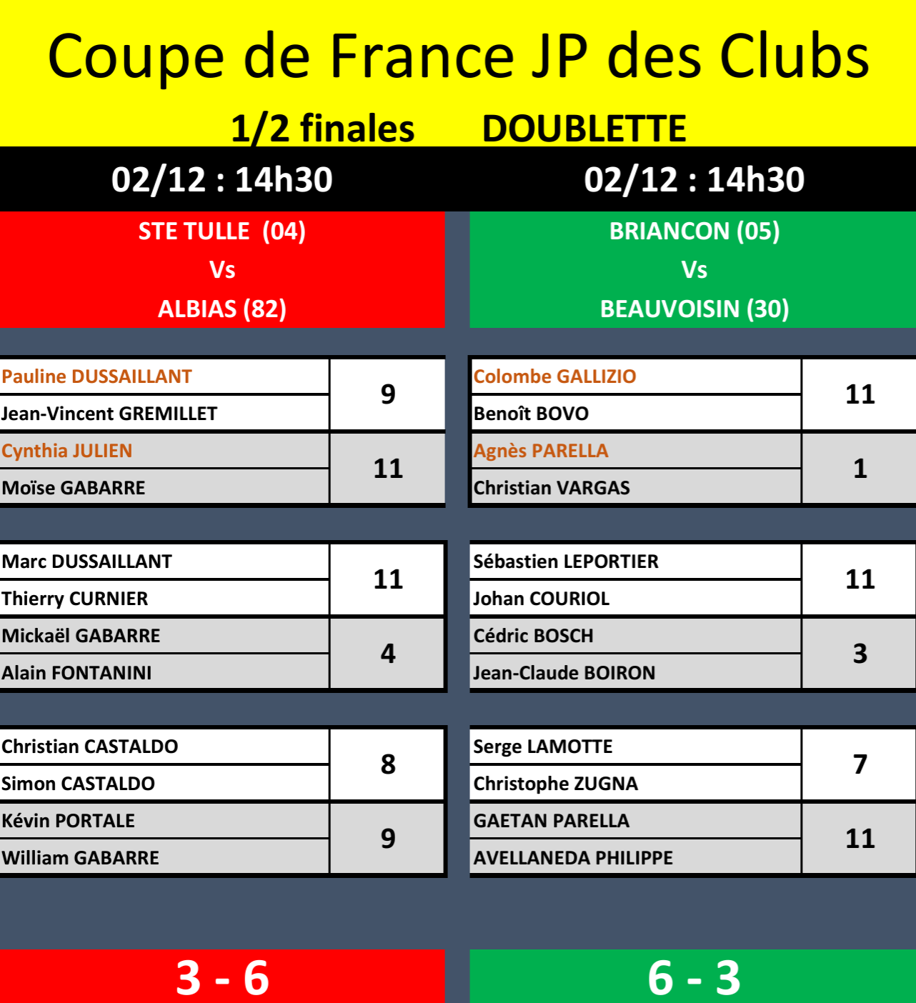 Résultats des 1/2 Finales : Les clubs surlignés en jaune gagnent leur 1/2 Finale